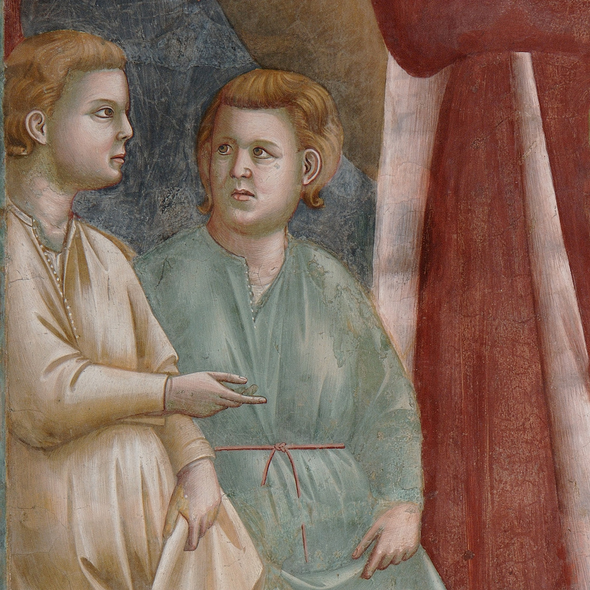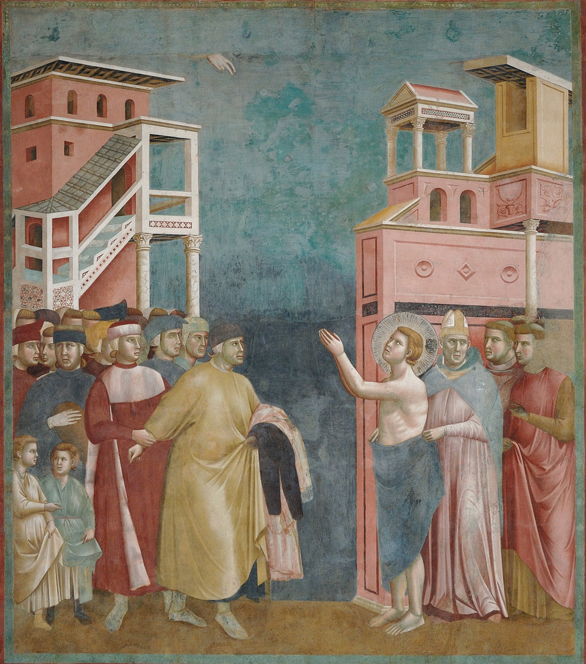 Di più: resta nudo come è nudo Cristo quando muore in croce. E grida al padre «Non ti chiamerò più padre. D’ora in poi chiamerò padre il Padre mio che è nei cieli». Assisi è una piccola città, tutti sappiamo dove fu montato il palco per ospitare gli attori che recitarono questa parte. Oggi la residenza vescovile non somiglia affatto alla città dei tempi antichi, salvo nel sottosuolo dove è riemerso un grande arco d’ingresso. E nel lato a valle, che nessuno vede ma dove c’è tutto. Fu così che il pittore poté ambientare l’episodio della rinuncia in un non luogo, una sorta di periferia disegnata da un architetto brutalista dei nostri giorni, con due curiose costruzioni che sembrano fatte con i mattoncini della Lego che si regalavano ai bimbi buoni e cattivi la notte di Natale: mura, scale, altane, ballatoi, semplicemente per dare slancio a due gruppi contrapposti di personaggi che simboleggiano la divisione di poteri tra la sfera civile – le magistrature comunali – interpellata da Pietro per ottenere giustizia, e la sfera religiosa – il vescovo e i suoi canonici – coinvolta nella scelta di Francesco. Fu così che il pittore si concentrò sulle maschere indossate dagli attori per nascondere i sentimenti. Da una parte Francesco che si spoglia e viene accolto sotto un mantello aperto da un vescovo, a significare l’abbraccio della Chiesa. Dall’altra il padre sconvolto dall’ira, che prende gli abiti smessi dal figlio e vorrebbe colpirlo con un pugno, se non fosse trattenuto da uno che ha le sembianze dell’ordine costituito. Dietro ancora c’è una folla di curiosi, benpensanti, maldicenti, ipocriti. Ci sono persino ragazzini armati di sassi e di fango, pronti a gettare sassi e fango in direzione di un loro quasi coetaneo che ha lasciato la retta via. Ecco: c’è un giovane che raccoglie pietre per costruire, mentre altri giovani raccolgono pietre per offendere. «Chi mi dà una pietra avrà una ricompensa, chi due pietre …». Ma anche «Tu sei sei buono e ti tirano le pietre, sei cattivo e ti tirano le pietre». Pietra scartate, istruzioni per l’uso.