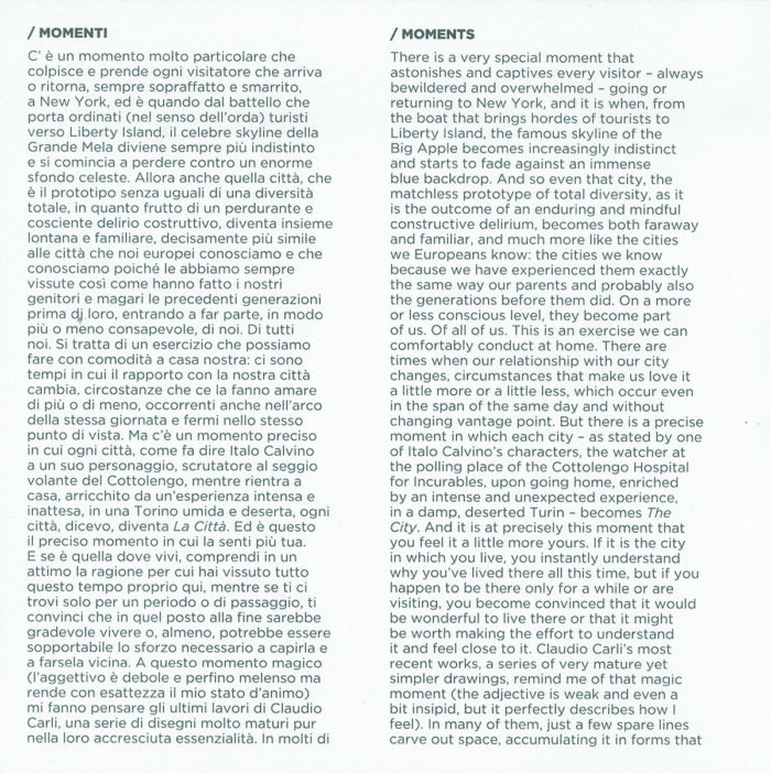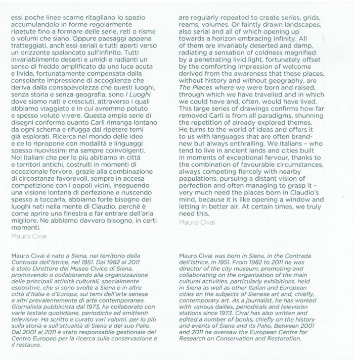 Infine, la mostra personale Carte a Palazzetto Silvestri, in Assisi nel 2012. La presentazione è dello scrittore senese ed esperto d’arte, Mauro Civai, che sa mettere a fuoco le qualità tecniche ed espressive del lavoro di Carli e definisce quei disegni “… molto maturi pur nella loro accresciuta essenzialità. In molti di essi poche linee scarne ritagliano lo spazio accumulandolo in forme regolarmente ripetute fino a formare delle serie, reti o risme o volumi che siano. Oppure paesaggi appena tratteggiati, anch’essi seriali e tutti aperti verso un orizzonte spalancato sul futuro”.