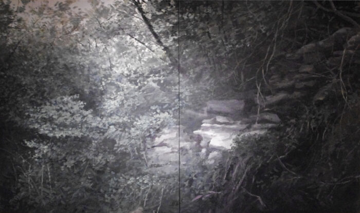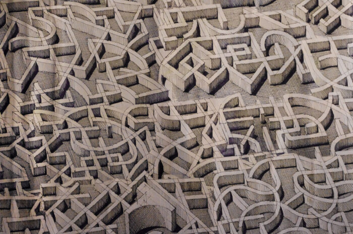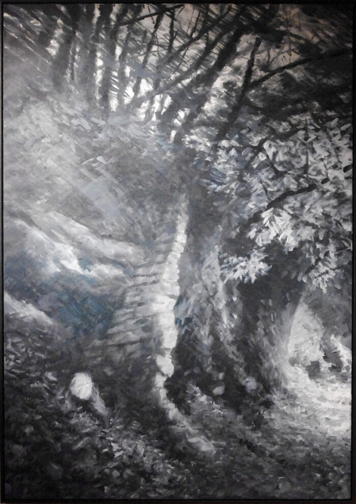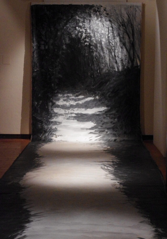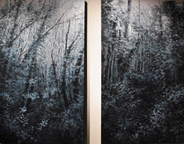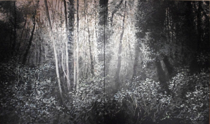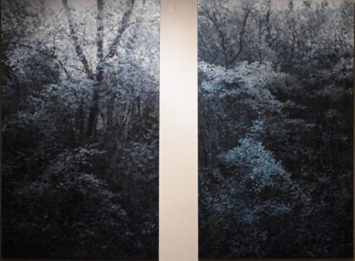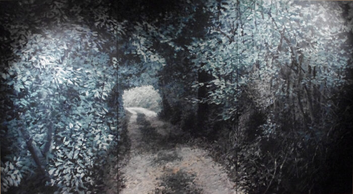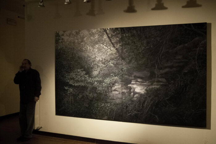 Il tema del bosco e del labirinto su cui si sviluppava la mostra erano le metafore dell’ “incanto” di quei paesaggi, naturale l’uno, artificiale l’altro, che però alludono anche alla possibile perdita di orientamento.