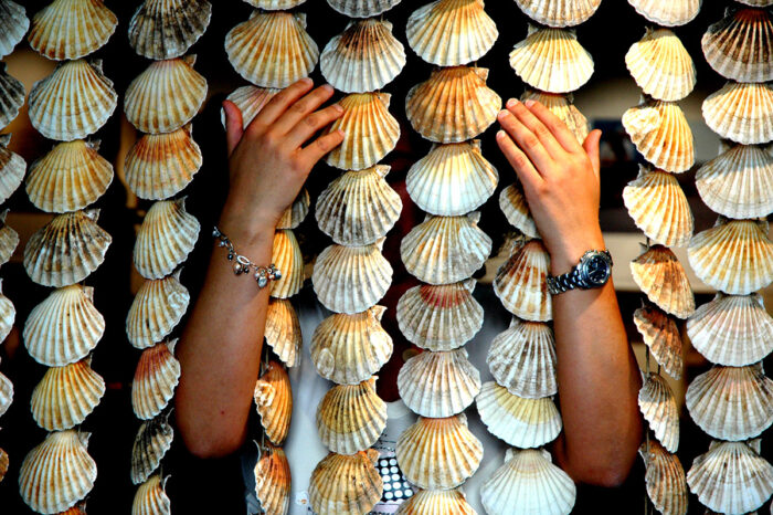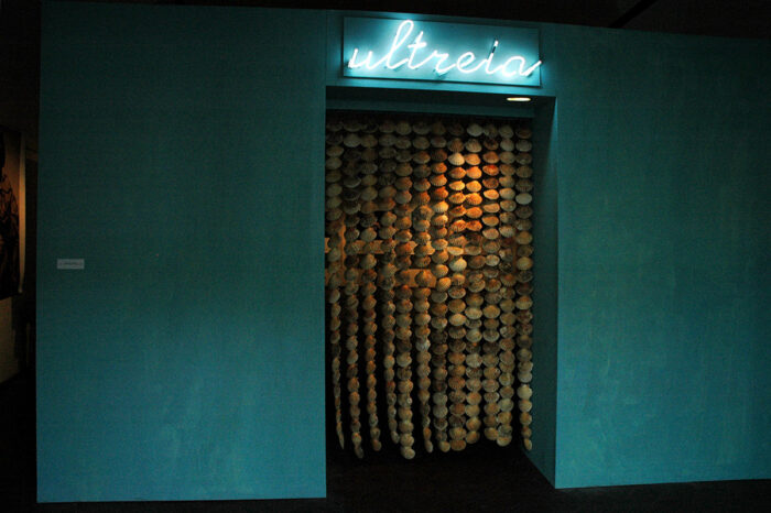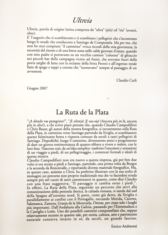Per l’ingresso alla mostra fotografica di Chris Bauer e Claudio Campodifiori dal titolo La ruta de la Plata —uno dei cammini che conducono verso Santiago de Compostela— Claudio fece un allestimento che poggiava sulla parola “ultreia” e sulle cosiddette conchiglie del pellegrino. La prima era il saluto e l’augurio ad arrivare al santuario, le seconde erano il simbolo del cammino fatto e allo stesso tempo, per l’artista, alludevano la memoria dei tempi dell’infanzia quando i «piccoli bar della campagna vicino ad Assisi avevano tende fatte di spago e tappi a corona che ‘suonavano’ sempre al passaggio di un avventore».