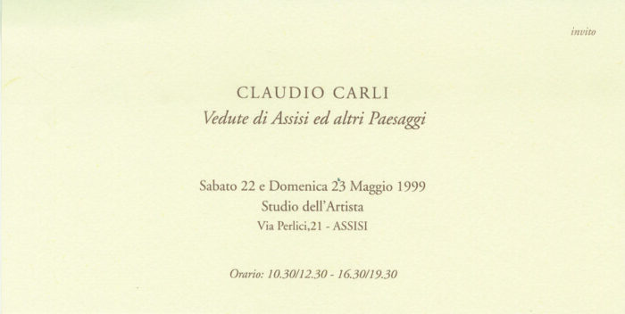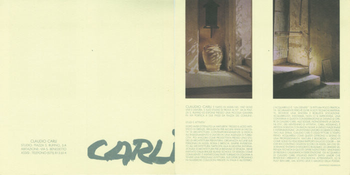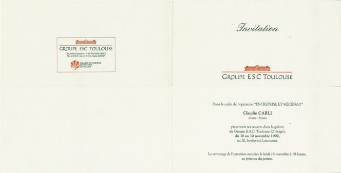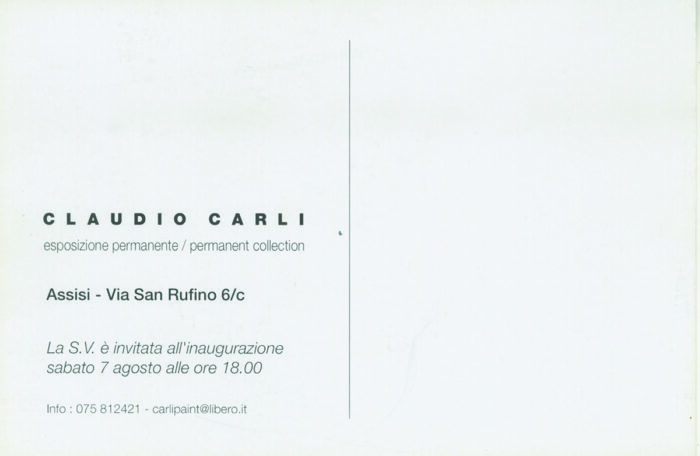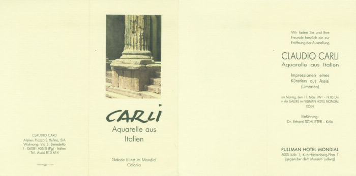 Inviti per mostre nello studio dell’artista, 1990-1999Inviti per mostre nello studio dell’artista, 1990-1999Inviti per mostre nello studio dell’artista, 1990-1999Inviti per mostre nello studio dell’artista, 1990-1999Claudio Carli, Groupe E.S.C. Toulouse, 20 Boulevard Lacrosses, 16-30 novembre 1992Claudio Carli Aquarelle aus Italien, “Kunst im Mondial”, Pullman Hotel, Kurt-Hackenberg Plarz 1, Köln 1991Bosco, olio/tela, 1991Campagna, olio/tela, 1991Orto di Marcello, olio/telaBosco, olio/tela, 1992la strada verso la luce”, olio/tela 1992Paesaggio, olio/tela, 1993Paesaggio, olio/tela, 1994. Natura morta, olio/tela, 1994