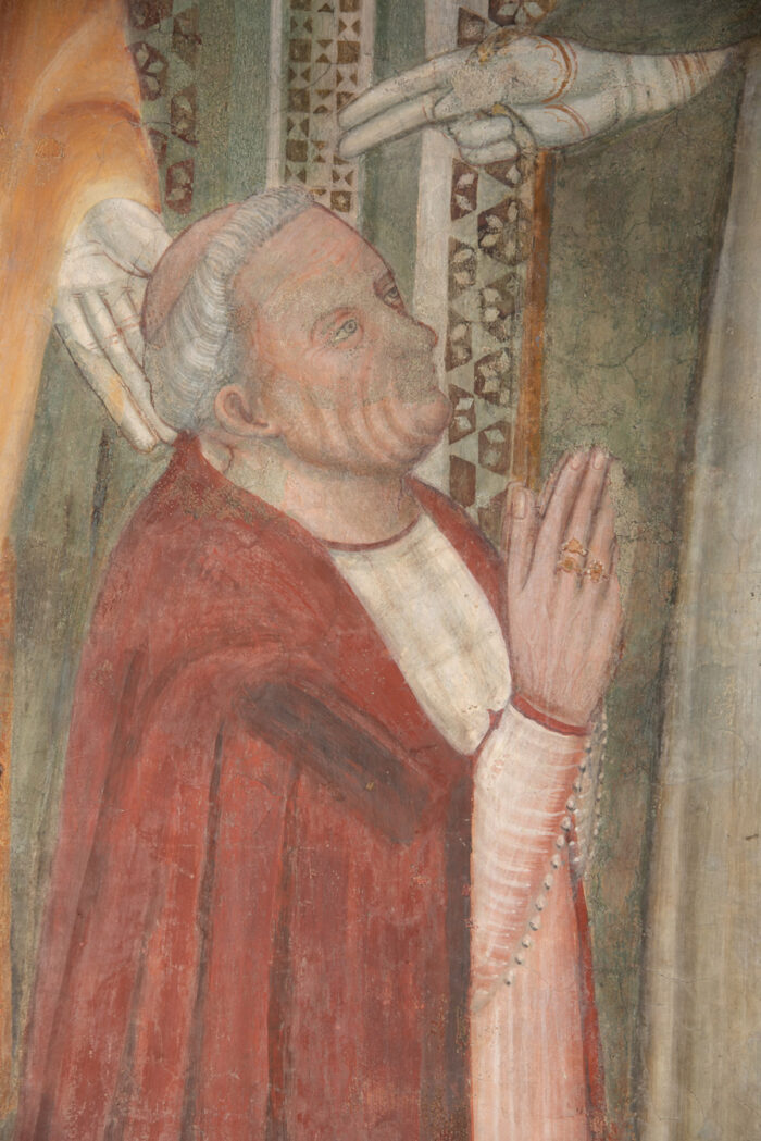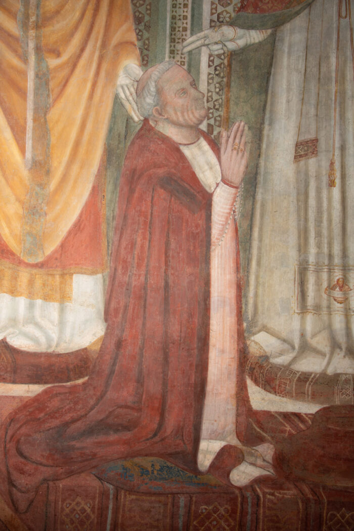 “Nella cappella de S.ta Catharina sta il corpo del cardinale Egidio Spagnolo il quale vedé il corpo de S.to Francesco et pagò cento Milia scutj per fabrica del convento”. È quanto racconta il Libro dei morti della chiesa di San Francesco nell’anno 1509, ma è tutto vero o è una mezza verità? Perché la cappella di Santa Caterina posta in fondo al nartece d’accesso nella chiesa di sotto di San Francesco esisteva prima che Egidio de Albornoz riportasse sotto il dominio della Chiesa di Roma le città che se ne erano allontanate al tempo del lungo autoesilio avignonese dei papi: non fu dunque il cardinale a farla costruire, come dimostrano le vetrate riconducibili a Giovanni di Bonino che vi s’incontrano, nelle quali non compare l’insegna del cardinale come invece accade in quasi tutte le vetrate delle cappelle fatte decorare da donatori particolari.